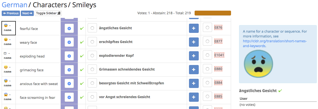 - It is often useful to view related languages to see how the emoji are handled. You can see the last release results at http://www.unicode.org/cldr/charts/latest/annotations/index.html , or open up the survey tool in another window and pick another language.
